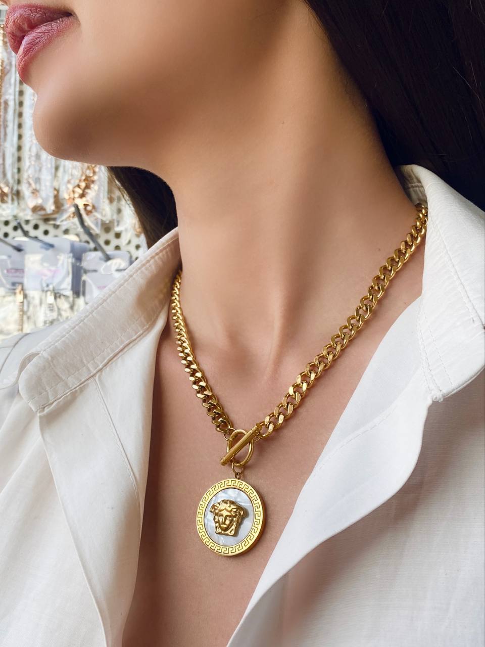 گردنبند استیل ورساچه با زنجیر کارتیه ست دستبند و انگشتر آن موجود است. در سایت با کلمه "ورساچه" جستجو کنید. با آبکاری با دوام صنعتی دولایه و ضدحساسیت