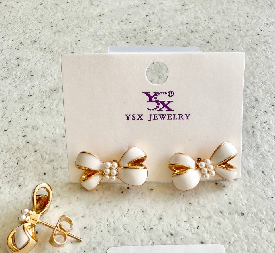گوشواره میخی مدل پاپیون سفید، برند ysx، آبکاری طلا، رنگ ثابت و ضد حساسیت.