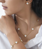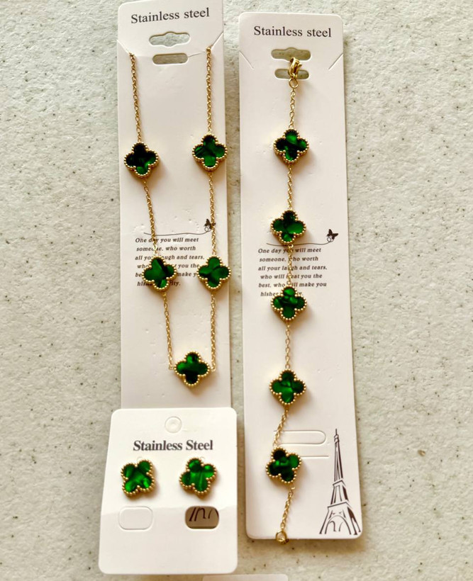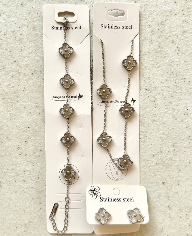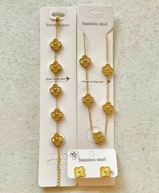 سرویس استیل زنانه مدل ونکلیف، شامل دستبند و گردنبند و گوشواره (گلگوش) ، با آبکاری با دوام صنعتی دو لایه و ضد حساسیت.