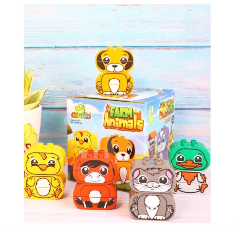 لگو پازلی حیوانات مزرعه شامل 5 حیوان مزرعه لگویی است که هر کدام از آن ها با استفاده از 4 قطعه آجره ساخته می شوند. کودکان با پیدا کردن و وصل کردن قطعات مختلف مربوط به یک حیوان می توانند حیوان مورد نظرشان را بسازند اما چیزی که این لگو را متمایز می کند این است که تمام قطعات قابلیت وصل شدن به یکدیگر را دارند و از اتصال قطعات بی ربط به هم می توان حیوانات عجیب غریب ساخت که زمینه ی گفتگو با کودک درباره ی ویژگی های مختلف حیوانات یا داستان گویی درمورد حیوانات عجیب و غریب و پرورش تخیل کودک را فراهم می کند.