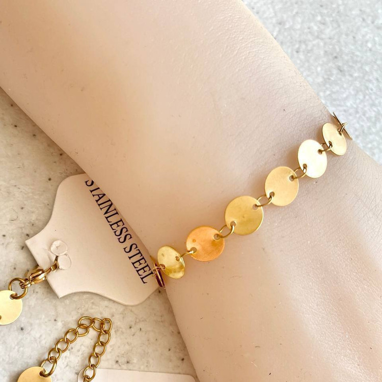 ست استیل زنانه، مدل سکه ای (پولکی)، شامل دستبند، گردنبند و پابند، با آبکاری با دوام صنعتی دو لایه و ضد حساسیت.