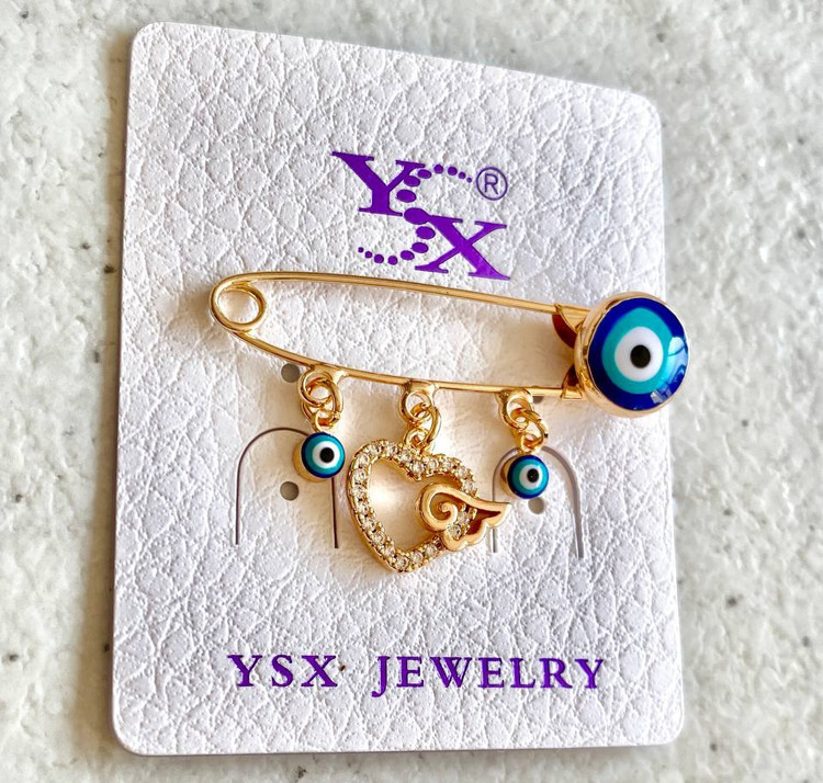 سنجاق سینه مدل چشم نظر (چشم زخم) با آویز قلب بال دار، برند ysx، با آبکاری طلا، رنگ ثابت و ضد حساسیت.