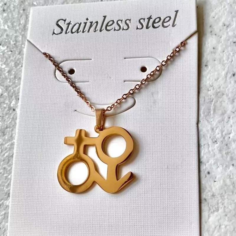 آویز گردنبند استیل، مدل نماد زن و مرد، با آبکاری دو لایه صنعتی و ضد حساسیت زنجیر را به صورت جداگانه از بخش "زنجیرها" تهیه بفرمایید. برای دیدن عکس گردنبند روی گردن مدل، در واتس اپ پیام دهید.